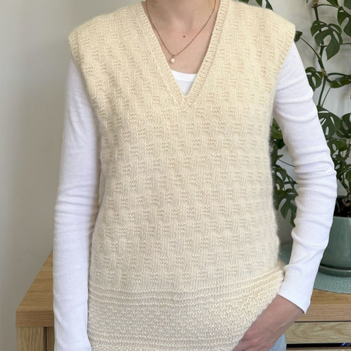 ChaskaStunning long line V Neck Vest featuring simple decorate stitches for band, then a block pattern for body of vest. Knitted in the soft and squishy ...